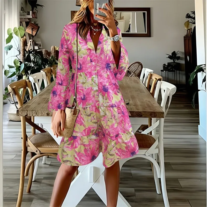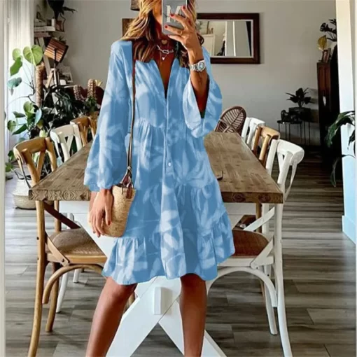 Spring Autumn Boho Vacation Shirt Dresses Women’s Sexy V-neck Flare Sleeve Elegant Ruffles Print Dress Spring Casual Loose Dress