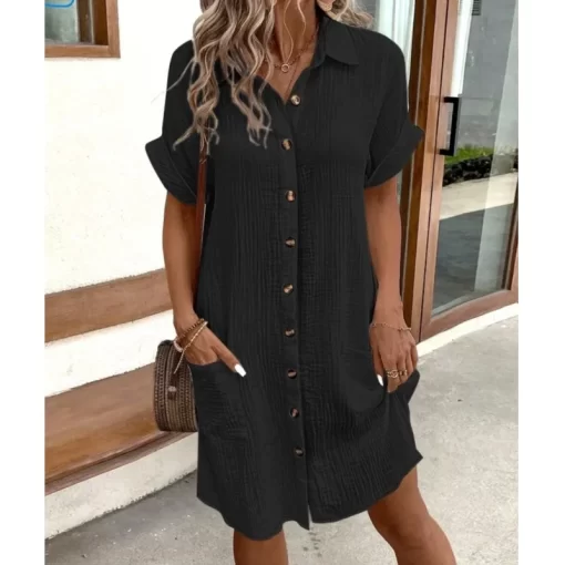 Women’s Summer Solid Shirt Dress Simple Short Sleeve Turn-down Collar Single Breasted Casual Elegant Ladies Loose Dresses